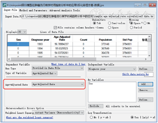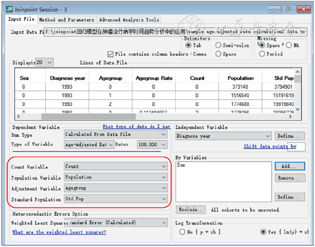 Joinpoint软件支持的可读入文件格式仅包括ASCII的后缀“.txt”文本和Excel spreadsheet的“.CSV”文件格式。读入数据可以通过SAS、Stata、SPSS、Excel或其他软件(如SEER*Stat)转换或导出。数据准备完成后通过Joinpoint软件打开,根据研究数据的不同类型选定因变量、自变量和分组变量读入软件中。因变量支持两种模式:一是提供已计算好的粗率、标化率、标准误等结果指标;二是提供各年龄组对应的病例频数、人口数和标化人口数等,由软件运行计算结果,再进行趋势分析。