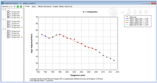 式中stdpopi为i年龄组标准人口,counti为i年龄组事件频数,populationi为对应人口数。(3)连接点数量:连接点的数量与研究数据的时间跨度的宽度(观测值数量)有关,系统默认最小为0,最大为5,用户可根据需求自行定义。但连接点过多的话运算相当耗时,因此软件推荐的观测值数量与系统默认最大连接数量有如下的对应关系:观测值数量分别为0~6、7~11、12~16、17~21、22~26、≥27时,默认最大连接点数量分别为0、1、2、3、4、5。除上述参数外,软件还支持“模型选择方法(Model select Method)”“AAPC计算范围设定”“APC/AAPC 可信区间算法”“自相关误差选项(Auto Errors Options)”等参数选择,供有特殊需要的高级用户,具体需求可参照软件说明,一般情况下选择默认设置即可。