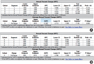 Joinpoint回归模型分析是流行病学时间趋势分析的常用方法。本文以肿瘤发病时间趋势分析为例,从模型的基本原理、分析步骤、实例演示和注意事项等方面进行系统阐述,以期将模型的方法原理与操作实践有机结合,为读者开展类似的研究分析提供参考。