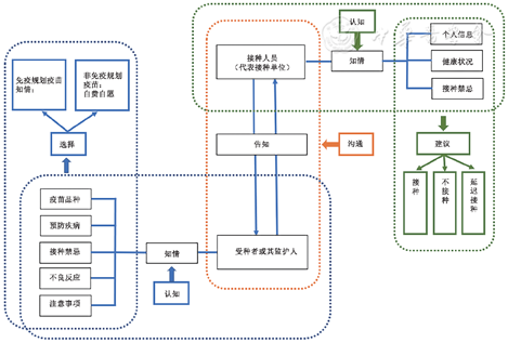 如图1所示,医疗卫生人员在依照规范具体询问后,受种者或其监护人如实告知受种者的个人信息、健康状况、接种禁忌等信息,医疗卫生人员知情上述信息并提出相应的接种建议,是否接种或延迟接种。医疗卫生人员告知受种者或其监护人所接种疫苗、疫苗所预防疾病、疫苗不良反应等信息,受种者或其监护人对上述信息知情、理解后做出选择。免疫规划疫苗为强制接种,强调受种者或其监护人对疫苗相关事项知情、理解和同意;非免疫规划疫苗为自愿自费接种,受种者或其监护人知情后做出同意或拒绝接种的决定。