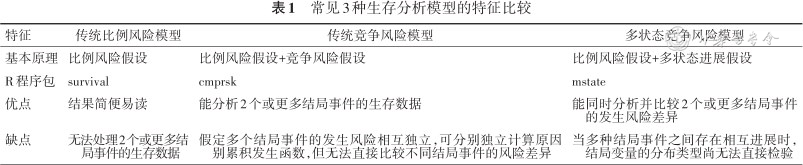 上述三种生存数据分析模型的共同点是基本假设均为比例风险假设。如比例风险假设不满足,则需要在上述模型基础上通过增加时间依赖变量等方法来进行调整和完善。实际分析时,应根据研究目的选择合适的模型,当比较多种结局风险差异时,优先选择多状态竞争风险模型。三种模型的优缺点比较见表1。