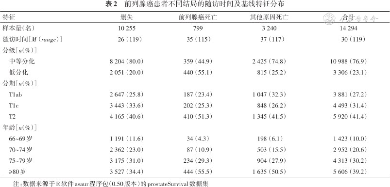 前列腺癌患者不同结局的随访时间及基线特征分布