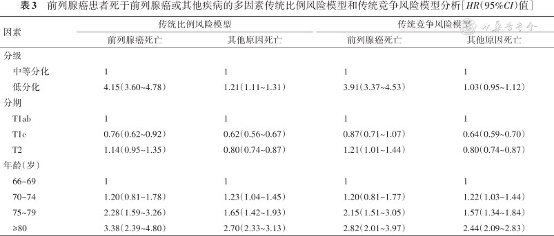 前列腺癌患者死于前列腺癌或其他疾病的多因素传统比例风险模型和传统竞争风险模型分析[HR(95%CI)值]