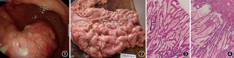 患者女,61岁。因"上腹部疼痛不适5年余"于2014年1月2日入院。患者曾于外院查B超提示"梅内特雷尔病",一直给予"西乐葆"保守治疗。后疼痛加重,偶有恶心,未诉其他不适。来本院门诊行胃镜检查,显示胃大弯侧黏膜皱襞明显增粗、隆起,部分表面呈脑回样改变(图1),活检病理诊断:(胃体)黏膜腺瘤伴中-重度不典型增生,CT:胃壁弥漫性增厚,边界模糊,考虑为恶性肿瘤。实验室检查:外周血白细胞总数:4.7×109/L,其中嗜酸性粒细胞比例:0.108。血清白蛋白低:28.3 g/L,总蛋白低:51.1 g/L,未予检测胃酸,择期行全胃切除术。