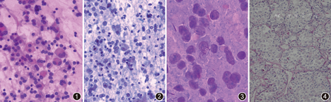 鉴别诊断:(1)颗粒细胞瘤:多发生在40~70岁成年人,女性稍多见,一般位于头颈部、躯干和四肢的皮肤和皮下组织,直径多在3 cm以下。穿刺细胞学涂片为一致性大圆形到多角形细胞,细胞边界清楚,胞质红染、丰富、颗粒状,细胞核小,染色质细。虽与腺泡状软组织肉瘤均为大圆形、多角形肿瘤,但其细胞核小,无明显核仁、无双核细胞可与腺泡状软组织肉瘤鉴别。(2)转移的肾细胞癌:细胞多为裸核状,细胞核较小,圆形,染色质细致,核仁细小。成团细胞胞质丰富、透明。无双核细胞,瑞氏染色无胞质内针形结晶,PAS阴性。影像学一般可见肾占位性病变。(3)无色素恶性黑色素瘤:细胞成团及散在,细胞圆形、多角形及梭形。胞质不见棕色色素。核卵圆形、圆形或多形性,可见核内包涵体,明显红染的大红核仁,核分裂象多见,细胞异型性明显,为高度恶性肿瘤。免疫组织化学检测HMB45、Melan A、S-100蛋白均为阳性。(4) 转移性副神经节瘤:副神经节瘤的良、恶性以肿瘤是否转移来界定。细胞学涂片瘤细胞多失去胞质或仅见少量淡染嗜酸性胞质,呈单个或少量几个细胞松散排列,细胞核呈卵圆形或长梭形,见小核仁[8],但其涂片不见双核细胞及丰富红染的颗粒状胞质,瑞氏染色亦不见棒状、针状结晶,可与腺泡状软组织肉瘤鉴别。(5)腺泡状横纹肌肉瘤:以青少年常见,常发生于四肢深部软组织,组织学可见瘤细胞呈巣状及腺泡状结构。细胞学涂片常见大量散在小圆形细胞及裸核细胞,部分肿瘤细胞可见中等量嗜酸性胞质,核圆形深染,核仁明显,核分裂象多见,不见双核细胞,易与腺泡状软组织肉瘤鉴别。