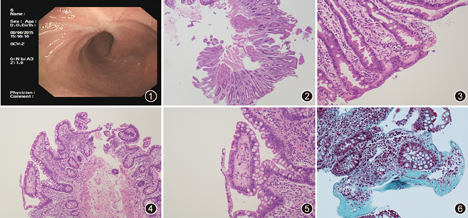 胃镜及肠镜活检组织病理诊断具体描述如下(2015年8月):镜下十二指肠黏膜绒毛萎缩(图2),黏膜全层淋巴细胞,浆细胞浸润,隐窝上皮内见淋巴细胞增多,淋巴细胞核小,无异型。黏膜表面上皮淋巴细胞浸润,上皮下见增厚的胶原带,不同区域胶原带厚度不均一,最厚处达35 μm,胶原带内可见血管,部分黏膜表面上皮脱落(图3)。"回肠末端"黏膜淋巴浆细胞浸润,绒毛萎缩不明显(图4),表面上皮下见明显增厚的胶原带最厚处达55 μm(图5),黏膜上皮内淋巴细胞增多。未见肉芽肿,未见明显中性粒细胞浸润,未见隐窝脓肿,无假幽门腺化生。胃窦及结肠黏膜活检组织未见异常,上皮下未见增厚胶原带。Masson三色染色:十二指肠及回肠末端黏膜上皮下增厚胶原带均显示绿色(图6)。免疫组织化学:十二指肠及回肠末端黏膜上皮内淋巴细胞均显示CD3阳性、CD20阴性、CD4少量阳性。