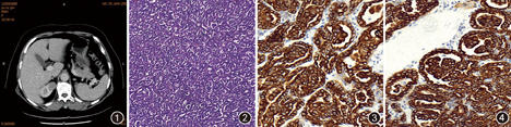 患者女,60岁。体检发现右肾肿瘤1个月,伴右侧腰腹部疼痛,于2016年7月入院。患者无低热、盗汗,无排尿费力及肉眼血尿,无尿急、尿痛及尿频。腹部CT检查示:右肾上极见等密度类圆形结节,强化程度低于肾实质,与肾脏界限欠清,考虑恶性肿瘤可能性大(图1)。临床诊断:右肾肿瘤。术中见右肾上极一肿物突出肾脏表面,直径约2 cm,切除肿物及部分肾组织送检。