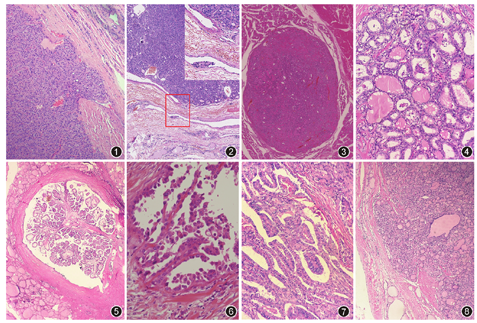 新版WHO中将FTC分为3组:微小浸润型、包裹性血管浸润型和弥漫浸润型。有关包膜浸润,新版中明确指出,肿瘤细胞/滤泡浸润至邻近正常甲状腺组织时,常可见到少许反应性纤维带(图8),以避免漏诊。FTC血管浸润的范围和预后相关,同时,新版中强调,FTC很少侵犯淋巴管,淋巴结转移同样罕见。因此包裹性滤泡型肿瘤诊断中如查见淋巴管侵犯,应重新考虑滤泡型PTC、而非FTC的诊断。该结论提示,原本诊断为FTC伴淋巴管侵犯和/或淋巴结转移的病例,应为浸润性包裹性滤泡型PTC。<4个血管浸润的预后要好于广泛浸润者。弥漫浸润型FTC弥漫浸润至整个甲状腺和甲状腺外软组织。并强调单纯血管浸润并非"弥漫浸润",但广泛血管浸润者预后差。新版WHO保留了旧版FTC的透明细胞型,新增了印戒细胞型、黏液型、肾小球样生长方式的FTC、梭形细胞型、类似腺样囊性癌的FTC、腺脂肪瘤、梭形细胞型;并将旧版嗜酸细胞型FTC归入到嗜酸细胞肿瘤中。其中TERT基因突变者预后差。FTC放射性碘治疗有效。