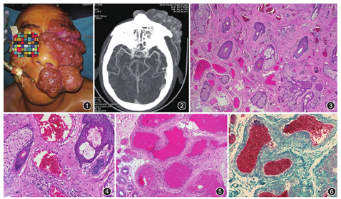 患者男,57岁,因左侧颌面部、上唇紫红色肿块57年于2017年12月25日入院。患者出生时就被发现左侧颌面部、上唇紫红色肿块,缓慢生长,肿块渐大,呈现明显肿块样,伴有功能障碍、皮肤瘙痒,局部遮盖眼睛,影响视物,局部遮盖嘴唇影响进食,不伴有疼痛,无出血、溃烂等并发症,无静脉曲张、肢体肥大等合并症。家族史:无类似疾病发生,否认家族性遗传病史。其他既往史、个人史及婚育史无特殊。体检:可见左侧颌面部、上唇深紫红色肿块,大小约18 cm×20 cm,边界不清,呈不规则样,病变区弥漫增厚,局部遮盖眼睛、嘴唇,影响视物及进食,局部皮温稍高,质地软,指压不完全褪色,局部未触及搏动及波动感(图1)。头颈部增强CT显示:左侧颌面部、上唇多发大团片状高低混杂密度影(脑、脑膜及眼部血管无明显异常),考虑血管肿瘤(图2)。术前行局部多点尿素注射,硬化瘤体,术中发现左侧颌面部、上唇大面积暗红色瘤体,侵及皮下,呈肿块型生长,富含血液,边界不清楚,沿瘤体于上眼睑、下眼睑、面部、上唇分别切除瘤体。