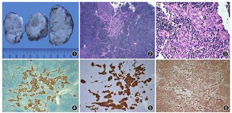 病理检查:结节样肿物1枚,重106 g,大小6.0 cm×5.5 cm×3.5 cm,有包膜,界限清楚,切面呈分叶状,灰白色、实性、质地坚实(图1)。低倍镜见肿瘤由纤维间隔分割成小叶状,且局部伴有包膜外纵隔脂肪组织微小浸润。此外,仔细观察发现肿瘤由2种形态完全不同的成分组成,绝大部分区域呈胸腺瘤样改变,在此背景上散在分布数个最大径0.1~0.2 cm的上皮样异型细胞巢(图2)。高倍镜下胸腺瘤样区域富含淋巴细胞,其间散布肿瘤性上皮细胞。上皮细胞排列形成巢团状,细胞椭圆形或多角形,细胞核大而疏松,可见中位核仁。免疫组织化学染色显示,肿瘤内丰富的淋巴细胞表达CD1a、末端脱氧核苷酸转移酶(TdT)、CD5和CD3,巢团状的上皮细胞表达广谱细胞角蛋白(CKpan)、p63、细胞角蛋白(CK)19和CK5/6,不表达CD5、CD117、甲状腺转录因子(TTF)1和CD56。上述形态改变及免疫组织化学结果支持B2型胸腺瘤的诊断。然而,散在分布的小灶上皮样细胞巢与此截然不同,这些细胞排列成实片状,体积比胸腺瘤上皮细胞大,圆形或多边形,异型性明显,胞质丰富嗜伊红,细胞核大,核膜清楚,染色质粗糙,有1~2个明显红核仁(图3)。追问病史,患者3年前曾行乳腺癌改良根治术,术后病理结果为右侧乳腺浸润性导管癌。据此,我们做了相应的免疫组织化学染色。小灶异型细胞巢内肿瘤细胞表达雌激素受体(ER;图4)、CK7(图5)、GATA3(图6)、GCDFP15和CK19,且上皮细胞膜抗原(EMA)部分阳性,不表达PR、HER2、p63和乳腺球蛋白。我们回顾了乳腺原发病灶的组织形态及免疫组织化学结果。高倍镜下乳腺原发灶内肿瘤细胞同样表现为细胞异型性明显,胞质丰富嗜伊红,细胞核大,核膜清楚,染色质粗糙,核仁明显,且CK7、ER、PR、GATA3、GCDFP15阳性,不表达HER2、p63和乳腺球蛋白。由此可见胸腺瘤内的小灶异型细胞巢与乳腺内癌灶无论是形态还是免疫组织化学结果都高度相似。