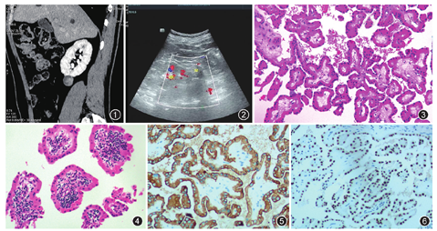 病理检查:大体观察见部分肾脏组织,大小约3.5 cm×3.0 cm×2.0 cm,于一极见一直径约2.5 cm肿物,切面囊实性,囊内充满灰红色乳头状物,质地软,境界清楚。镜下观察:肿瘤界限清楚,见纤维性包膜,由具有纤维血管轴心的乳头状或管状乳头状结构组成(图3),表面覆盖单层立方形或柱状细胞,胞质颗粒状、嗜酸性,细胞核小,位于远离基底膜的胞质顶部,核仁不明显,乳头或管腔边界光滑,乳头间质见淋巴细胞呈片状浸润(图4)。免疫组织化学结果:瘤细胞表达GATA3(图5)、广谱细胞角蛋白(CKpan,图6)、细胞角蛋白(CK)7、MUC1、CD10、P504s、PAX8及E-Cadherin,且波形蛋白、肾细胞癌标志物(RCC)、CD117及CK20阴性,Ki-67阳性指数约2%。