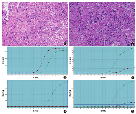 经过荧光定量PCR反应和信号采集,所有5例样本RNA内参HEX信号扩增曲线均有升起;临床确诊患者手术石蜡样本RNA FAM信号(N基因)扩增曲线升起(Ct值35.48),ROX信号(ORF1ab基因)曲线未升起。重复试验FAM信号扩增曲线升起(Ct值36.00),ROX信号曲线未升起。结合2次检测结果,该例患者病理石蜡样本新型冠状病毒阳性。同时作为对照的2例无感染病理石蜡组织样本和2例正常人群咽拭子样本病毒核酸检测均为阴性。