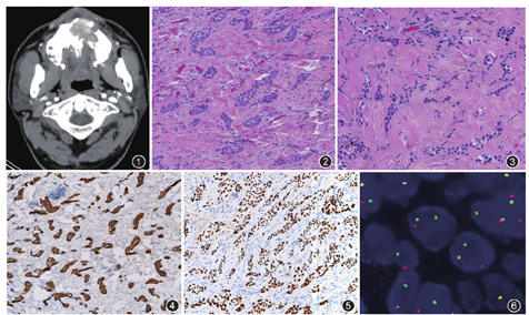 病理检查:上颌骨肿物,大小约1.5 cm×1.0 cm×0.3 cm,切面灰红灰黄质软。镜下观察:在硬化的纤维间质背景下,肿瘤细胞成小巢团、条索状、梁状分布(图2,图3),侵犯了周围横纹肌组织,并有小灶钙化。上皮性肿瘤细胞多呈圆形、卵圆形,轻度不规则/多形性,胞质嗜酸性,核大深染,缺乏明显异型性,染色质细腻,核仁及核分裂象不明显,另见有极少数较大的胞质透亮的细胞。首次病理诊断为上皮源性恶性肿瘤,免疫组织化学呈广谱细胞角蛋白阳性,细胞角蛋白(CK)19强阳性,CK5/6强阳性(图4),p63强阳性(图5),E-钙黏蛋白有膜染色,CK7阴性,Ki-67阳性指数3%。荧光原位杂交(FISH)检测结果:43%肿瘤细胞呈EWSR1基因断裂(图6),聚合酶链反应(PCR)及DNA测序:未发现BRAF V600E突变。