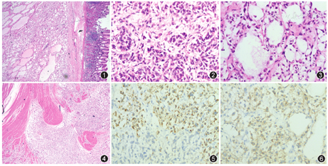 病理检查:附部分胃黏膜灰白灰红色结节样肿物一个,体积5.0 cm×4.2 cm×4.0 cm,切面灰白,半透亮,局部囊性变。低倍镜下肿瘤界限似乎尚清,无明显包膜(图1)。局灶表面黏膜呈溃疡后修复改变,黏膜间质中见肿瘤细胞浸润。瘤细胞密度不均,可见少到中等量嗜伊红胞质,细胞界限不清。细胞密集区肿瘤细胞略呈上皮样形态,排列呈小巢状或条索状,可见腺管形成的趋势,细胞核轻度异型(图2)。稀疏区肿瘤细胞核呈卵圆形或短梭形,肿瘤细胞弥漫片状分布于黏液样基质中,部分区黏液聚集呈肺水肿样结构,部分区呈微囊样(图3)。肿瘤内血管大小不等,以薄壁毛细血管和血窦为主,可见大的厚壁血管。肿瘤组织内散在淋巴细胞、浆细胞浸润。近浆膜侧肿瘤内见束状平滑肌,提示肿瘤组织在固有肌层内浸润性生长,被残留平滑肌分隔呈结节状(图4),未见明确核分裂象。免疫表型:广谱细胞角蛋白(CKpan)部分上皮样细胞弱到中等强度阳性(图5),波形蛋白阳性,上皮细胞膜抗原(EMA)灶状阳性,CD10弱阳性(图6),CD56弥漫阳性,CD34血管阳性,Ki-67阳性指数小于1%,平滑肌肌动蛋白(SMA)、结蛋白、H-caldesmon、CD117、DOG1、Calretinin、第八因子相关抗原(FⅧRAg)、D2-40、甲胎蛋白(AFP)、CK5/6、CK7、CK20、S-100蛋白、突触素、嗜铬粒素A(CgA)、琥珀酸脱氢酶B(SDHB)均阴性。复旦大学附属肿瘤医院会诊免疫组织化学结果:CKpan、CD10均阳性,Calponin、CD117、CD34、结蛋白、DOG1、SMA均阴性,Ki-67阳性指数小于2%。