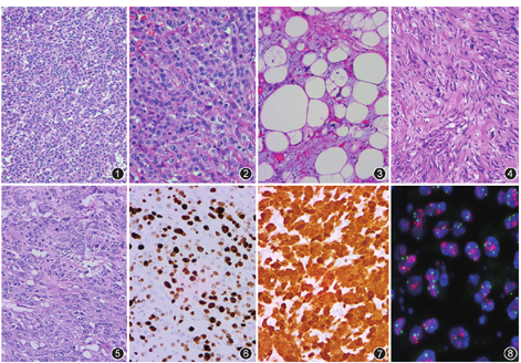 鉴别诊断:(1)近端型上皮样肉瘤:好发于盆腔、会阴等部位,肿瘤细胞圆形上皮样,显著异型性,泡状核、核仁明显,常伴有地图状坏死;部分病例肿瘤细胞可表现为显著的横纹肌样特征,免疫组织化学肿瘤细胞CKpan、EMA阳性,INI1缺失表达,约一半病例CD34阳性,FISH检测无MDM2扩增可与上皮样DDLPS鉴别[9]。(2)软组织肌上皮癌:肿瘤组织排列构型类似肌上皮瘤,但肿瘤细胞显示显著的异型性,核分裂象多见,免疫组织化学表达多种上皮及肌上皮标志物,部分病例有EWSR1基因易位[10]。(3)上皮样恶性外周神经鞘膜瘤:细胞呈显著的上皮样,核仁显著;肿瘤呈多结节状生长,间质纤维黏液样,弥漫强阳性表达S-100蛋白,可与上皮样DDLPS相鉴别[11]。(4)上皮样多形性脂肪肉瘤:形态学类似于肾上腺皮质癌或肾细胞癌,仔细寻找通常可见多形性脂母细胞,有时分布较为局限,提示广泛取材的重要性;细胞遗传学表现为复杂的染色体变化,无MDM2基因扩增[12]。此外,由于伴上皮样特征的DDLPS好发于后腹膜,尚需要与癌、上皮样胃肠道间质肿瘤及间皮肉瘤等相鉴别[4]。