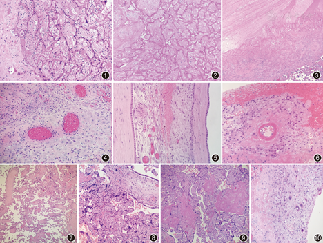 其他一些胎盘病理表现如绒毛间隙纤维蛋白样物沉积增多、绒毛凝集、胎盘部位滋养巨细胞增生、未成熟中间滋养细胞增生及绒毛外滋养细胞假囊肿等,在过去被认为与母体血管病变相关,但阿姆斯特丹国际胎盘工作小组共识认为没有足够证据表明这些表现是诊断MVM的指标[1,16]。绒毛间隙纤维蛋白样物沉积会阻塞母体血液在胎盘内的流动,大量的纤维蛋白样物沉积在绒毛间隙(图9),不仅影响胎儿与母体的物质交换,而且对母体血循环造成障碍,但它并不仅在MVM的情况下出现。绒毛凝集是指相邻的终末绒毛(2~20个)被纤维蛋白样物黏附,导致绒毛间隙消失,血液灌注减少,绒毛表面滋养细胞退化,绒毛间质纤维化或细胞核碎裂,该病变被认为是绒毛滋养细胞的局部缺血性坏死(早期梗死)。胎盘部位滋养巨细胞增生和未成熟中间滋养细胞增生在先兆子痫的胎盘可被发现。胎盘部位滋养巨细胞增生是指底蜕膜中出现合体滋养细胞,可能是EVT的早衰表现(图10)。由于没有明确的正常参考值,因此很难客观诊断。未成熟中间型滋养细胞增生是指表层底蜕膜中出现10~20个未成熟中间滋养细胞(胞质嗜酸性或空泡状,成熟型胞质为深紫色)。另外,严重的MVM病例可能导致胎儿肾灌注不足,引起胎儿尿量较少和羊水过少,对胎膜的检查可以发现羊膜结节。