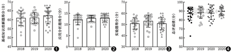 2. 案例式为主的直播翻转课堂可提升分析解决问题能力:以案例讨论为主的教学模式,使每位学生主动参与各教学环节。调查结果显示,约90%的学生认为案例讨论为主的在线翻转教学能有效激发学习兴趣,提高学习主动性,有助加深病理学知识的理解。与MOOC导学相结合的案例式翻转授课模式,要求学生厘清知识的内在关联,绘制思维导图,构架个性化知识体系,转变机械记忆为主的学习模式。在线讨论时,通过网络资料查询和屏幕共享还可增强学习的便捷性和有效性。比较近3年应用分析性题目的得分情况(图2),2019和2020年的成绩均高于2018年,表明其差异产生的原因可能与2019和2020年均采用案例翻转教学方式有关,说明案例式教学可提高分析解决问题能力。