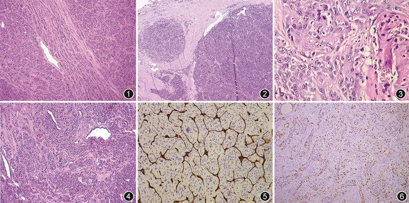 病理检查:灰褐肿块一个,大小7 cm×7 cm×4 cm,切面黄褐实性、质脆,部分区域可见出血坏死。镜下观察见肿瘤由2种成分组成:(1)肿瘤细胞以实性、岛状排列为主,部分区域呈小梁状排列(图1),瘤细胞大小形态一致,圆形或卵圆形,核中等大,无核沟及核内假包涵体,灶状区域细胞核大,异型性明显,部分细胞巢内可见小滤泡结构,可见肿瘤性坏死及包膜侵犯(图2);(2)鳞状细胞癌区域(约占肿瘤的20%)癌细胞大,胞质丰富,核大深染,核质比增大,核分裂象多见,可见细胞间桥、角化珠和不全角化细胞(图3)。经充分取材、制片,可见两种癌相互过渡移行区域,分界不清(图4)。免疫表型上,实性、岛状、梁状排列的肿瘤细胞甲状腺球蛋白(Tg)、甲状腺转录因子(TTF)1、PAX8、bcl-2、E-cadherin均阳性,细胞角蛋白(CK)19部分细胞阳性,降钙素、嗜铬粒素A(CgA)、突触素、癌胚抗原(CEA)、白细胞共同抗原(LCA)、p53均阴性,Ki-67阳性指数约15%,肿瘤细胞巢之间的纤维血管间隔CD34阳性(图5)。鳞状细胞癌肿瘤细胞CK5/6、p40、p63、CK19、p53、PAX8(图6)阳性,Tg、TTF1、CD5、CD117阴性,Ki-67阳性指数约35%。