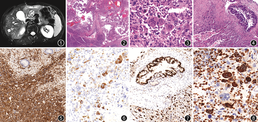 在鉴别诊断上,当取材有限,切片中没有找到分化较好的导管腺癌成分时,UCPOGC很难与胰腺原发的肉瘤相鉴别,如本组例2原单位诊断即为软组织肿瘤。因胰腺原发的肉瘤极其罕见,所以诊断之前必须完全排除未分化癌,鉴别点包括肉瘤不表达上皮标志物,且无KRAS基因突变。而当UCPOGC合并导管腺癌时需与癌肉瘤鉴别,鉴别点在于后者缺乏破骨样巨细胞。