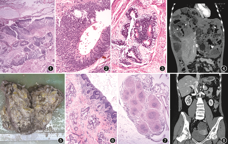 患者女,18岁。8年前因“高级别实性未成熟畸胎瘤”行手术治疗及术后化疗,术后数月即出现肿瘤复发,再次手术切除,为“实性未成熟畸胎瘤(1级)”;术后5年出现腹腔占位,此后3年间数次化疗无效,肿瘤持续增大并出现压迫症状,为治疗行第三次手术,诊断为“生长性畸胎瘤综合征,伴腹膜胶质瘤病”。术后随访30个月,患者无复发。此类疾病组织学形态呈良性,但具有类似恶性肿瘤持续生长或广泛种植的生物学行为,放化疗无效,彻底的手术切除能够给患者带来良好的预后。因此,临床医师应加深认识,正确诊断,积极手术,避免不必要的放化疗。