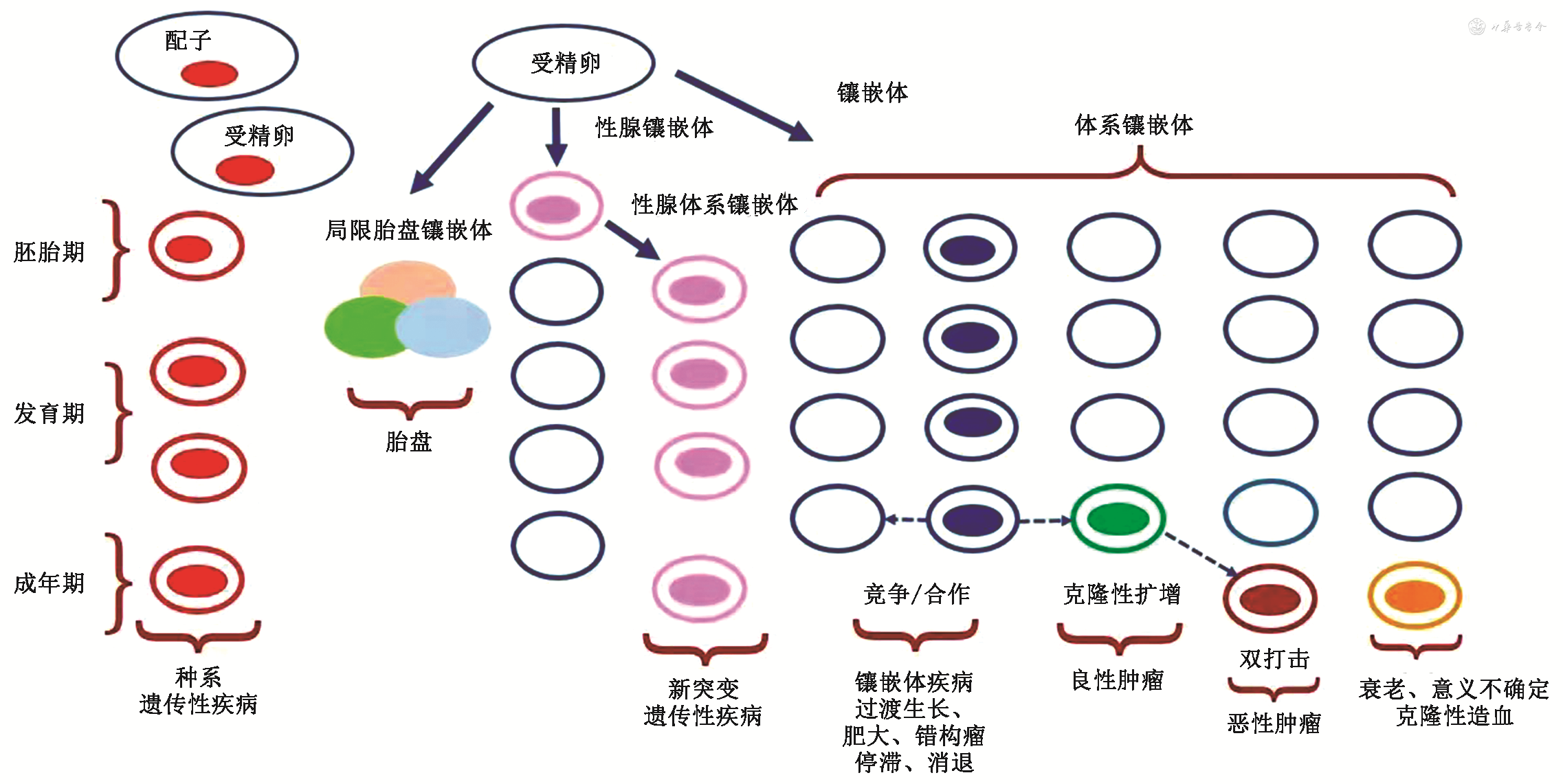 镶嵌体(mosaicism)是指个体存在两个或以上遗传学差异的细胞类型的现象,普遍存在于多细胞生物体。其遗传学改变(基因突变或染色体倍体异常)通常发生于受精卵的发育分化过程中,因而其遗传学变异细胞似“马赛克”式(mosaic)镶嵌分布于机体组织或器官,其相关疾病呈现为节段性、区域性、灶性分布,即镶嵌式疾病(mosaic disease)[1, 2]。镶嵌体主要来自受精卵形成后(postzygotic)细胞的有丝分裂过程中,基因突变发生的时间或阶段性而影响不同细胞谱系,发育早期突变影响谱系多,而后期则受累谱系少。镶嵌体(mosaicism)与嵌合体(chimerism)有着根本的区别,后者是指个体有异体细胞的嵌入,如妊娠时不同受精卵之间、胎儿与母体之间细胞的相互输入,以及器官、骨髓移植、输血等形成医源性嵌合体[3]。