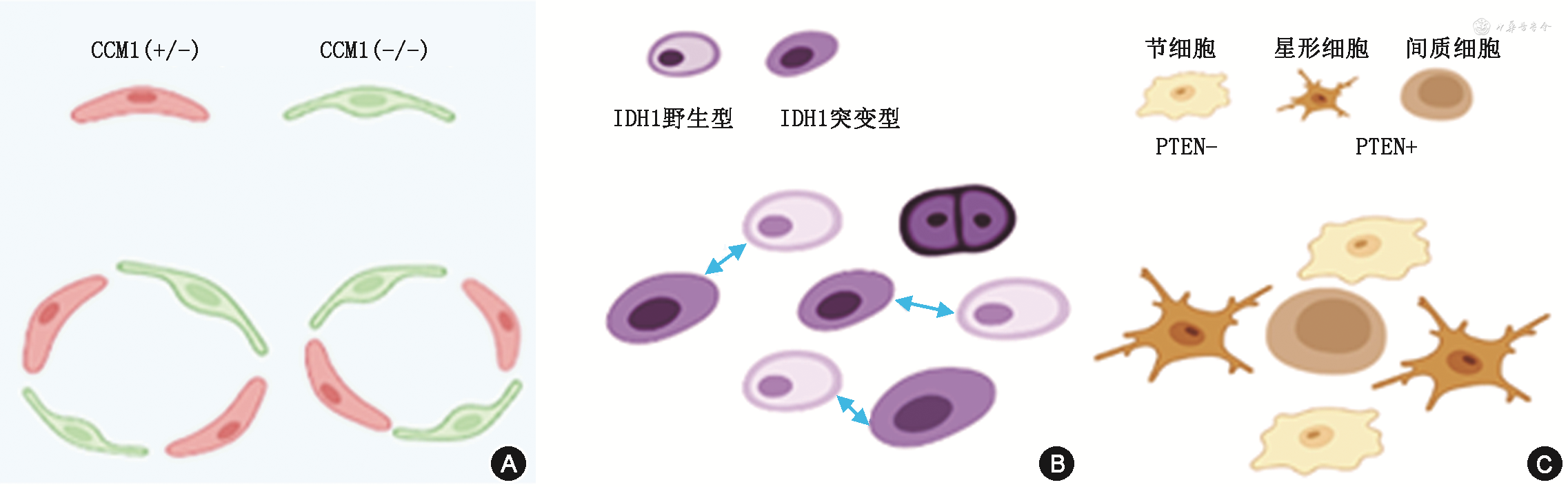 2.组织病理学:镶嵌体疾病组织学导致良性肿瘤或者恶性肿瘤其组织病理学与散发肿瘤基本一致。其他主要为过度生长改变,如表皮或附属器痣、色素痣,血管畸形、脂肪及纤维结缔组织错构瘤等。近年来,利用免疫组织化学对镶嵌体疾病突变基因的组织检测发现一些特点。Rath等[22]对一项脑海绵状血管畸形(cerebral cavernous malformations,CCMs)病例研究表明:在一胚系CCM1患者血管内皮细胞发现CCM1的第二次突变,并且血管病变中的内皮细胞具有胚系CCM1杂合突变(+/-),以及CCM1双突变内皮细胞(CCM1-/-)所内衬,表明其CCM1的二次突变所致,也表明病变组织有突变与非突变细胞构成(图2A)。另外,利用抗IDH1 R132H突变抗体检测Ollier病患者内生性软骨瘤显示其肿瘤细胞部分为IDH1 R132H突变阳性,与野生型肿瘤细胞呈镶嵌式分布(图2B)[23]。而镶嵌式PTEN失活突变导致的胶质神经元性错构瘤(glioneuronal harmatoma)组织中,仅节细胞失去PTEN表达,而星形细胞及内皮细胞则具有PTEN的表达(图2C)[24]。因此,这些有限的研究提示镶嵌体病变可能为突变与非突变细胞混合构成,形成“马赛克式”改变,表现为所谓“发育畸形”。类似这样肿瘤与非肿瘤成份共同的现象也存在于部分良性肿瘤,如乳腺纤维腺瘤、骨巨细胞瘤,但一般此类肿瘤中肿瘤细胞与非肿瘤细胞在类型有所不同[25, 26]。随着镶嵌体基因突变的免疫组织化学检测抗体的开发,如PIK3CA、AKT1等,相信有关镶嵌体疾病的组织病理学特点会有更多的发现。