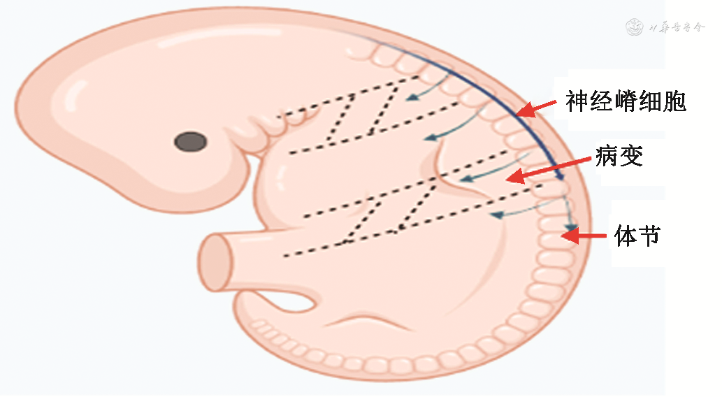 3.体细胞镶嵌性疾病发生机制:镶嵌体疾病的区域性或节段性表现可能与胚胎发育时期体节(somites)的形成,以及多潜能分化能力的神经嵴细胞(neural crest cells)在各体节的迁入有关(图3)。基因突变的细胞在特定体节发育不同阶段形成各区段的骨、软骨、肌肉的病损,而神经嵴细胞迁移进入不同的体节分化形成黑色素细胞、神经纤维,以及内皮细胞、脂肪、纤维组织等也导致区域性病变[27, 28]。如将突变GNAS导入鸡胚的体节可以诱导类似的体节性表型,类似于进行性骨性异常增生患者GNAS突变导致的皮肌节分布样的异位骨化[29]。而PIK3CA-突变相关过度生长症候群的不同临床解剖学方式与其基因-突变发生时间有关[30]。镶嵌体疾病基因突变所致细胞过度生长分子机制与肿瘤相似。但也有一些差异,部分镶嵌体疾病与年龄和发育相关,如前述先天性血管瘤(CH)始于宫内发育期,但出生后其病变呈现两种不同过程,RICH于出生一年内病变消退,而NICH却持续存在,提示其他基因改变会影响突变细胞的功能表型[18]。部分骨纤维结构不良也呈现随年龄增加而出现病变停止的现象,可能为GNAS激活突变干扰骨骼干细胞的自我更新(self-renewal)通路所致,当病变持续时基因突变细胞失去自我更新,通过凋亡消失,而无突变的正常细胞得以生长,逆转FD表型[31, 32]。因此,在镶嵌体疾病中基因突变细胞尚处于相对优势(relative dominance),其激活信号通路也刺激周围同类细胞及正常细胞产生发育畸形或错构瘤表现,而随着克隆竞争取得绝对优势(absolute dominance)后则发展为克隆性的良性肿瘤性病变。因此,在基因突变的时间与空间、突变基因的是否具有主导性、突变细胞与非突变细胞的关系方面与肿瘤具有一些差异,肥大、畸形、错构瘤与肿瘤为形成一个疾病的谱系改变,在一定条件下可以转化(图1),其具体详细过程尚待阐明。