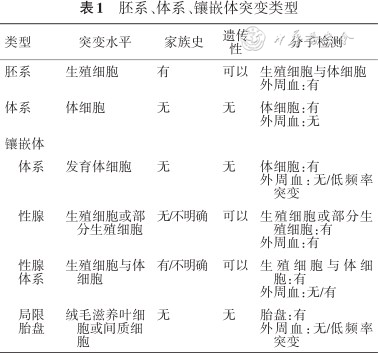 体细胞镶嵌体疾病本质为基因突变所致,所有分子检测方法均适用,如PCR、二代测序、荧光原位杂交检测染色体异常等。但由于镶嵌体为部分细胞的基因突变,因此其检测通常需要高度灵敏的分子检测技术[33],并根据不同镶嵌体类型,采取相应的病变组织、外周血、唾液、生殖细胞(睾丸穿刺)进行检测(表1)。同时,家族遗传信息在鉴别中极为重要:体细胞系无家族史,性腺体系混合型可有家族史,一般只有经大量流行病分析无家族式发病情况下才能确定为体系镶嵌体。另外,在组织病理标本基因突变相应免疫组化检测也值得开展。