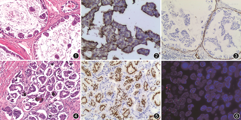 病理检查:(1)原发乳腺肿瘤,大体检查:快速送检肿瘤组织2块直径分别为3.2 cm和2.5 cm,剖面黏液样,未见明显纤维包裹。镜下观察:大量扩张的导管,导管内细胞轻度异型增生,比正常导管上皮细胞核稍大,形态较单一,未见明显的核分裂象,排列成微乳头状,未见坏死,未见明确脉管癌栓(图1),腋窝淋巴结未见转移(0/14)。标本已充分取材(快速送检组织已全部取材,含乳腺导管内癌病变者共22个蜡块,根治乳腺标本按规范取材,其余象限各取2~3块,乳头和腋窝淋巴结全部取材),选取其中的8个可疑浸润蜡块进行4种肌上皮标志物免疫组织化学检测,结果肌上皮标志物均连续性表达,证实未见明确浸润灶。免疫组织化学示:8张乳腺导管内癌切片,上皮细胞膜抗原(EMA)阳性(图2),肌上皮Calponin阳性(图3),细胞角蛋白(CK)5/6阳性,CD10阳性,平滑肌肌动蛋白(SMA)阳性,雌激素受体(ER)约2%阳性,孕激素受体(PR)阴性,HER2 1+,Ki-67阳性指数约3%;(2)胸壁复发肿瘤,大体检查:送检胸壁皮下肿块,脂肪样组织花生米大,剖面见灰白结节2枚,直径分别为0.5 cm和0.8 cm。镜下观察:癌细胞排列呈中空、小团或桑葚样,与间质之间存在透明间隙,细胞极性反转,呈特殊的“倒置”性生长,个别区域可见沙砾体,未见正常乳腺导管(图4)。免疫组织化学示:ER约30%阳性,PR阴性,HER2 2+,Ki-67阳性指数约10%,CK5/6阴性,Calponin阴性,CK7阳性,乳腺特异性标志物GATA3阳性(图5),GCDFP15阳性,肺和甲状腺特异性标志物甲状腺转录因子1(TTF1)阴性,卵巢浆液性乳头状腺癌特异性标志物PAX8阴性、WT1阴性。分子病理检查:HER2基因经荧光原位杂交(FISH)检测证实无扩增(图6)。补充患者原发灶BRCA突变基因检测,结果为阴性;原发灶ER、PR再次检测,结果基本无变化。