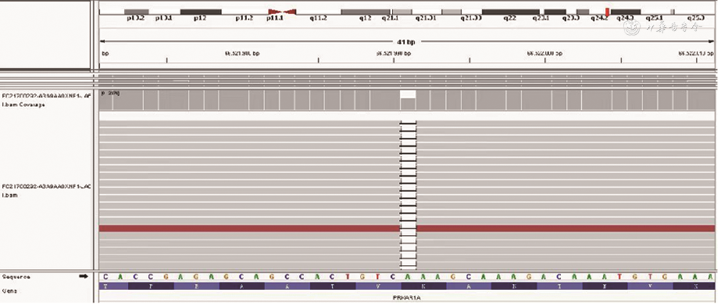 病理检查:大体检查,左侧睾丸根治切除标本,总大小6.0 cm×4.0 cm×3.2 cm,沿睾丸最大径剖开切面,其内见肿物呈灰黄实性,质中,肿瘤大小2.8 cm×1.5 cm×1.0 cm,伴有出血和质硬区(图2)。肿瘤与周围组织界限欠清,距附睾最近0.3 cm。附睾大小3.0 cm×0.8 cm×0.7 cm,切面灰黄实性,质软。精索长6 cm,直径0.7~0.9 cm。镜下观察:肿瘤与周围睾丸实质边界欠清,肿瘤细胞排列成条索状,小灶区域呈小管状,细胞多角形,具有丰富的嗜酸性胞质,核仁清晰。局灶核分裂象易见,约4个/10 HPF。可见脉管内瘤栓。间质可见大片钙化,部分黏液样变,伴中性粒细胞浸润(图3, 4, 5, 6)。免疫组织化学染色:α抑制素、S-100蛋白、波形蛋白、Calretinin 阳性,上皮细胞膜抗原(EMA)、结蛋白、广谱细胞角蛋白(CKpan)、CD117、细胞角蛋白(CK)7、嗜铬粒素A(CgA)阴性,Ki-67阳性指数约8%,β-catenin膜阳性,突触素灶状阳性(图7,8)。肿瘤425基因panel二代测序(图9):肿瘤组织检出PRKAR1A第8号外显子第648位碱基缺失c.648del(p.A217Qfs*5)突变,引起从217位丙氨酸开始发生移码致使终止密码子提前编码,产生截短蛋白。