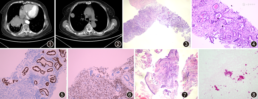 病理检查:送检组织有3类。(1)右肺上叶灰白色穿刺组织2条,长0.5、1.0 cm,直径均为0.05 cm。(2)支气管镜取材:灰白色组织数粒,直径约0.5 cm。(3)另送纤维支气管镜刷片组织。镜下观察:(1)右肺上叶胸膜下穿刺组织中可以见到2种成分:背景为梭形细胞肿瘤,瘤细胞排列成束条状、席纹状或无结构生长模式,部分区域细胞密集,部分区域细胞稀疏,可见胶原沉积,核分裂象罕见;在梭形肿瘤区域内可见多灶异形腺体浸润,细胞核增大、深染(图3,4)。免疫组织化学染色显示梭形瘤细胞阳性表达STAT6(图5)、CD34,Ki-67阳性指数2%;异形腺上皮阳性表达细胞角蛋白(CK)7、甲状腺转录因子1(TTF1,图6)、Napsin A、上皮细胞膜抗原(EMA),Ki-67阳性指数30%。分子检测:表皮生长因子受体(EGFR)基因第18、20、21号外显子野生型,第19号外显子缺失突变;间变性淋巴瘤激酶(ALK)融合基因检测:未见融合。(2)支气管取材镜检:(右下基底支)送检组织中可见异型腺体,呈不典型腺管样、核大、深染(图7),免疫组织化学染色见腺体细胞阳性表达CK7、广谱细胞角蛋白(CKpan)、TTF1、Napsin A,Ki-67阳性指数30%。(3)纤维支气管镜刷片:查见异型细胞团,核中度异形,排列紊乱(图8)。