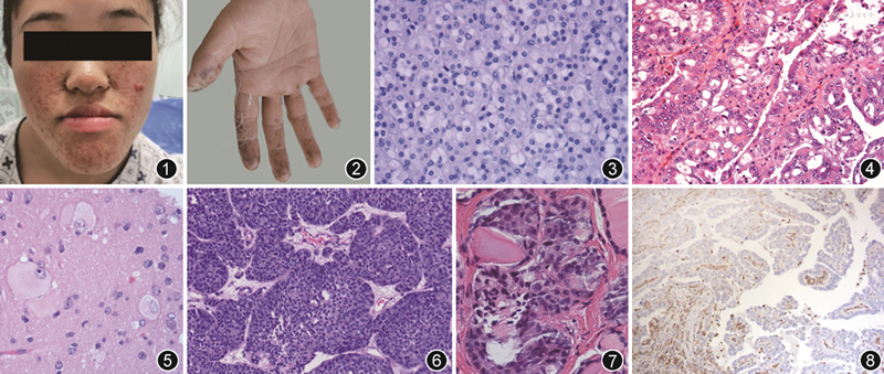 7.伴随身体异常。部分ICSS伴有先天性骨骼、皮肤等身体异常表现,可作为识别和诊断ICSS的线索。部分CDH1基因突变相关的遗传性弥漫型胃癌家系成员同时合并唇裂或腭裂的先天性畸形[15]。Birt-Hogg-Dub(BHD)综合征患者除发生肾细胞癌外,90%的患者可发生皮肤纤维毛囊瘤。结节性硬化症患者可表现为鼻面部多发血管纤维瘤(图1)、指甲纤维瘤、皮肤鲨鱼皮斑等皮肤异常。黑斑息肉综合征(Peutz-Jeghers综合征)常见面部、口唇周围、手掌(图2)、足底等皮肤、黏膜色素沉着。此外,皮肤牛奶咖啡斑可见于10%的正常人,但多量的牛奶咖啡斑应怀疑NF1、Turcot综合征、共济失调性毛细血管扩张综合征、结节性硬化症等。