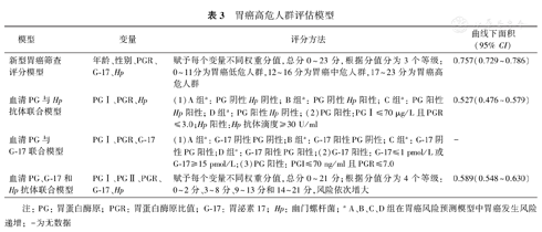 | 新型胃癌筛查评分模型 | 年龄、性别、PGR、G-17、Hp | 赋予每个变量不同权重分值,总分0~23分,根据分值分为3个等级:0~11分为胃癌低危人群,12~16分为胃癌中危人群,17~23分为胃癌高危人群 | 0.757(0.729~0.786) |