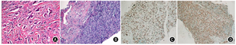 患者男,51岁,2018年9月10日因发现右侧颏下、耳下包块生长4月余入院。入院查体示,右侧腮腺弥漫性肿大,右侧颏下扪及一约1 cm×1.5 cm肿物,质硬,按压无疼痛,界限欠清,皮肤表面色泽正常,皮温不高。颌面部CT示,右侧腮腺肿大,增强呈中度强化,腮腺强化不均,其内见散在强化结节;双侧颌下淋巴结肿大,考虑炎性病变。2018年9月13日于全身麻醉下行右侧腮腺浅叶切除+面神经解剖+颏下包块切除术,术后病理示,颏下肿物查见腺癌,脉管内查见癌栓,可见神经侵犯,请临床检查乳腺是否有肿块,若排除乳腺癌转移后,考虑涎腺原发导管腺癌。免疫组化检测结果示,CK7(+),GCDFP-15(+),CK5/6(灶+),CEA(个别细胞+),CD34(血管+),P63(-),CerbB-2(-),CK20(-),TTF-1(-)(图1)。乳腺及淋巴结超声检查未见明显乳腺肿物及腋窝淋巴结肿大。患者于2018年9月28日于四川省肿瘤医院行右腮腺癌扩大根治+面神经松解减压+右颌下腺切除+右颈部淋巴结清扫+颈总动脉剥离术,术后骨扫描示,全身骨骼广泛骨转移征象。依据病理及影像学检查明确诊断为右侧腮腺导管腺癌(pT4aN2M1 Ⅳc期)伴全身多发骨转移。患者行多西他赛+顺铂方案化疗4个周期,使用唑来膦酸抑制骨不良事件。规律随访复查,病情稳定。