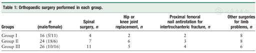| Groups | n (male/female) | Spinal surgery, n | Hip or knee joint replacement, n | Proximal femoral nail antirotation for intertrochanteric fracture, n | Other surgeries for limb problems, n |