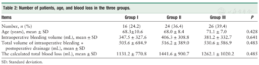 Table 2 summarizes the number of patients, age, and blood loss in the three groups. There were no significant differences between the three groups in patient age (P = 0.428), intraoperative bleeding volume (P = 0.641), total volume of intraoperative blood loss and postoperative drainage (P = 0.483), and total perioperative blood loss calculated by Nadler’s formula and Gross’ formula (P = 0.485).
