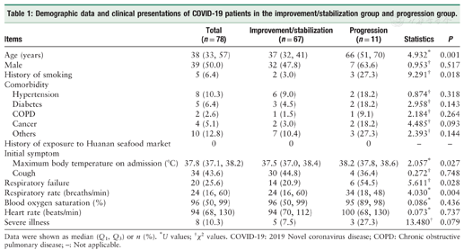 Patients tested positive for the COVID-19 based on nucleic acid detection were included in this study. Patients were admitted to 3 tertiary hospitals in Wuhan between December 30, 2019, and January 15, 2020. Individual data, laboratory indices, imaging characteristics, and clinical data were collected, and statistical analysis was performed. Based on clinical typing results, the patients were divided into a progression group or an improvement/stabilization group. Continuous variables were analyzed using independent samples t-test or Mann-Whitney U test. Categorical variables were analyzed using Chi-squared test or Fisher’s exact test. Logistic regression analysis was performed to explore the risk factors for disease progression.