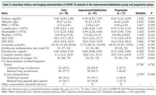 In the present study, 78 patients with COVID-19 associated pneumonia included 39 males and 39 females. No patient had a history of exposure to the Huanan Seafood Market. The median age (Q1, Q3) was 38 (33, 57) years, and only 15 patients were aged ≥60 years (19.2%). Among the 78 patients, there were 70 patients with the common-type (89.7%) and eight patients with the severetype (10.3%). Re-examination after 2 weeks of hospitalization showed that among the 70 patients with the common-type symptoms, there were eight patients with progression and 62 patients with improvement/stabilization. Among the eight patients with the severe-type symptoms, three patients showed progression (including two deaths) and five showed improvement/stabilization. A total of 11 patients (14.1%) were included in the progression group, and 67 patients (85.9%) were included in the improvement/stabilization group.