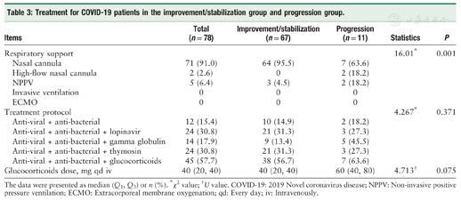 Among the 78 hospitalized patients, the most common treatment was a combination of anti-virals + anti-bacterials with glucocorticoids (45/78, 57.7%). The most commonly used anti-viral drug was ribavirin, and the most commonly used anti-bacterial drugs were cephalosporins or quinolone antibiotics. The median glucocorticoids dose was 40 (20, 40) mg intravenously (iv) every day (qd) and there was no significant difference between the two groups (60 [40, 80] vs. 40 [20, 40] mg qd iv, U= 4.713, P= 0.075). The proportions of patients using different drug protocols including anti-virals + anti-bacterials, anti-virals + anti-bacterials + glucocorticoids, anti-virals + antibacterials + gamma globulin, anti-virals + anti-bacterial + thymosins, and anti-virals + anti-bacterials + lopinavir between improvement/stabilization group and progression group were not significantly different (P > 0.05). All hospitalized patients had some degree of hypoxia. Nasal cannula was the most common form of respiratory support (71/78, 91.0%), followed by continuous non-invasive positive pressure ventilation. The progression group typically had more severe hypoxia and was significantly more likely to receive higher levels of respiratory support compared to the improvement/stabilization group (χ2 = 16.01, P = 0.001) [Table 3].