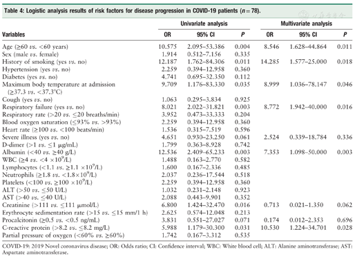 Logistic analysis results of risk factors for disease progression in COVID-19 patients (n= 78).