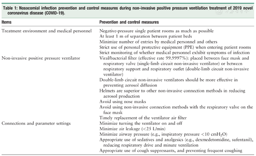 Nosocomial infection prevention and control measures during non-invasive positive pressure ventilation treatment of 2019 novel coronavirus disease (COVID-19).