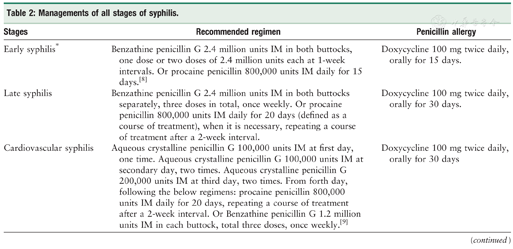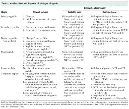 Syphilis, caused by Treponema pallidum subsp pallidum (T. pallidum), is a chronic, systemic human disease transmitted through sexual contact. The incidence and prevalence of syphilis is still high in China.[1] To guide the prevention measures and management of this disease, we renew the guidelines on diagnosis and treatment of syphilis [Supplementary file, http://links.lww.com/CM9/A292]. Manifestations and diagnosis of all stages of syphilis are presented in Table 1, and management in Table 2.