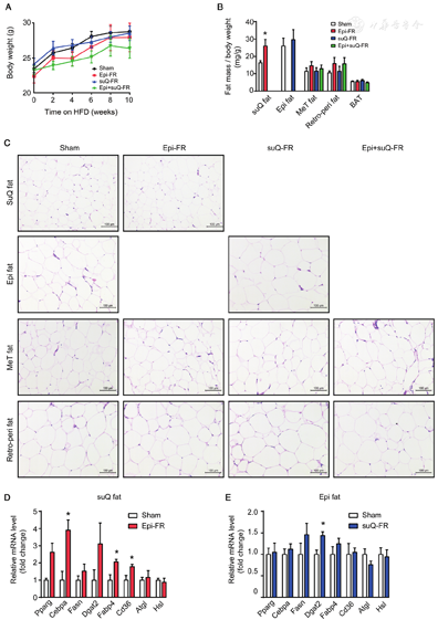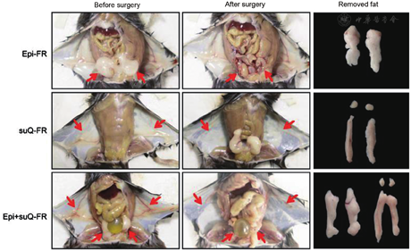 Male low-density lipoprotein receptor (LDL-R) knockout (KO) mice were randomly divided into four groups and subjected to epididymal fat removal (Epi-FR) surgery, subcutaneous fat removal (suQ-FR) surgery, both subcutaneous and epididymal fat removal (Epi + suQ-FR) surgery, or sham-operation. After 1 week of recovery, all mice were given a high-fat diet (HFD) for 10 weeks to induce metabolic disorders.
