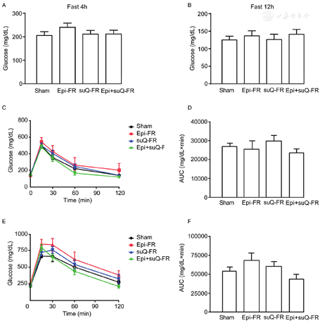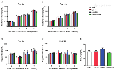 In the Epi-FR group and the sham-operated group, the mean numbers of the residual subcutaneous fat were 28.59 mg/g and 18.56 mg/g, respectively. The expression of relative genes such as Pparg, Cebpa, Dgat2, Fabp4 and Cd36 in the residual subcutaneous fat increased 2.62, 3.90, 3.11, 2.06, 1.78 times in the Epi-FR group compared with that in the sham-operated group. Whereas in the other fat-removal groups, the residual fat depots had no significant change in either size or gene expression, as compared with those of the sham-operated group. Plasma lipid and glucose levels and insulin sensitivity, as detected by the glucose tolerance test, were not significantly alleviated in the three fat removal groups. Liver mass or lipid content was not attenuated in any of the three fat removal groups. The atherosclerosis burdens in the entire inner aorta and aortic root did not decrease in any of the three fat removal groups.