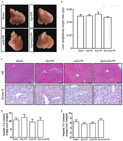 There was no significant alteration in the general hepatic appearance [Figure 5A] or total liver weight [Figure 5B] between the fat-removed groups and the sham-operated group. Oil Red O and HE staining showed that no significant improvement in hepatic lipid accumulation between the fat-removed groups and the sham-operated group [Figure 5C], and this was further confirmed by hepatic lipid extraction and direct detection of hepatic TG and TC content, as shown in Figure 5D and 5E. Our data demonstrated that preliminary adipose removal did not protect against diet-induced fatty liver in LDL-R KO mice.