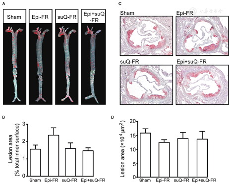 The entire aorta and aortic root sections were prepared as previously described.[19] Briefly, the entire aorta was cut open longitudinally and stained with Oil Red O. The total atherosclerotic burden in the entire aorta was presented as the percentage of Oil Red O-positive area in the entire inner surface area of the aorta. Aortic root sections were obtained by serial cross-sectioning at the aortic root level at 7 μm. The total atherosclerotic burden at the aortic root was visualized by Oil Red O staining.
