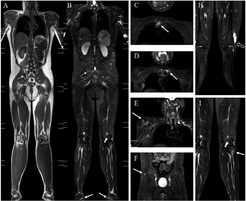Reliability analyses included intrareader intraclass correlation coefficients (two-way mixed model, absolute agreement definition). The computer software package (SPSS version 25, SPSS, IL, USA) and the R package (R version 3.5.3) were used to perform all statistical analysis. Data were described using means (mean value and standard deviation) and proportions (percentages, %). For the main analyses, WB-MRI results at the lesion level were handled as dichotomous data (present/absent). The MRI results were compared with the clinical results using the McNemar-Bowker test. A P value < 0.05 indicated a statistically significant difference. The correlation of clinical and MRI outcomes was calculated using the Spearman rho (ρ).