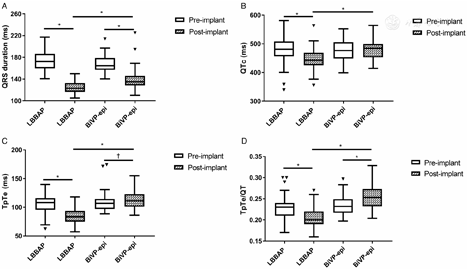 To the Editor: Cardiac resynchronization therapy (CRT) is an effective treatment for advanced chronic heart failure (HF) patients with reduced ejection fraction. Despite its beneficial effects on cardiac function, traditional biventricular epicardial pacing (BiVP-epi) could not reduce ventricular arrhythmias (VAs) burden in all HF patients.[1] The increase in the dispersion of ventricular repolarization (DVR) after BiVP-epi in non-responders may play a role.[2] Recently, left bundle branch area pacing (LBBAP) has been reported as a feasible option for CRT delivery, while little is known about its influence on DVR. This retrospective study aimed to thoroughly evaluate the changes of DVR after LBBAP in HF patients and compare the repolarization features between LBBAP and BiVP-epi.