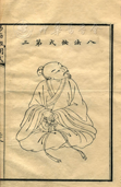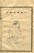 最早出现导引图的《易筋经》传本,当属道光二十三年(1843)友竹山房刻本《易筋洗髓二经》[8]。此书为山左祝阿(今山东省德州市齐河县)马一贞(字竹君)校刊,由"易筋经""洗髓经"2部分组成。但此传本中的导引图,并非后世所熟悉的"韦驮献杵、摘星换斗、三盘落地、出爪亮翅等十二势"。只有八法:拉式第一、抓式第二、按式第三、揪式第四、拧式第五、推式第六、举式第七、提式第八,名为"外壮八段锦"。"外壮神力八段锦"之名,见于现存最早的《易筋经》传本––日藏康熙抄本,有名无图。在友竹山房本首次出图,但没有相关的功法文字说明。究其图形,均为坐式,与明代各种导引吐纳书中较为常见的"八段锦坐功图"非常相似(图1,图2,图3,图4)。