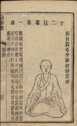 十二图势与易筋经十二图初见于清光绪元年(1875)聚文斋刻本《卫生易筋经》[10]。此书有同治十三年(1874)冬季宋光祚序,言其刻书的目的。宋氏是当时河南藩库厅(钱粮库)的长官,刻成的书板即收藏于河南藩库厅官署,故光绪元年本应该是此本的初刻。该本分上下2卷,原分别署为"易筋经上卷:西竺达摩祖师著,西竺圣僧般剌密谛译义,南洲白衣海岱游人订正"及"易筋经(附录)下卷,来章氏辑"。十分清晰地表述了上卷是《易筋经》原文,下卷则是来章氏辑补的"附录"。书中载有3套不同的导引功法:十二势图、易筋经十二图、却病延年法。前1种见于卷上,属《易筋经》正文的内容;后2种见于卷下,属来章氏增补的内容。